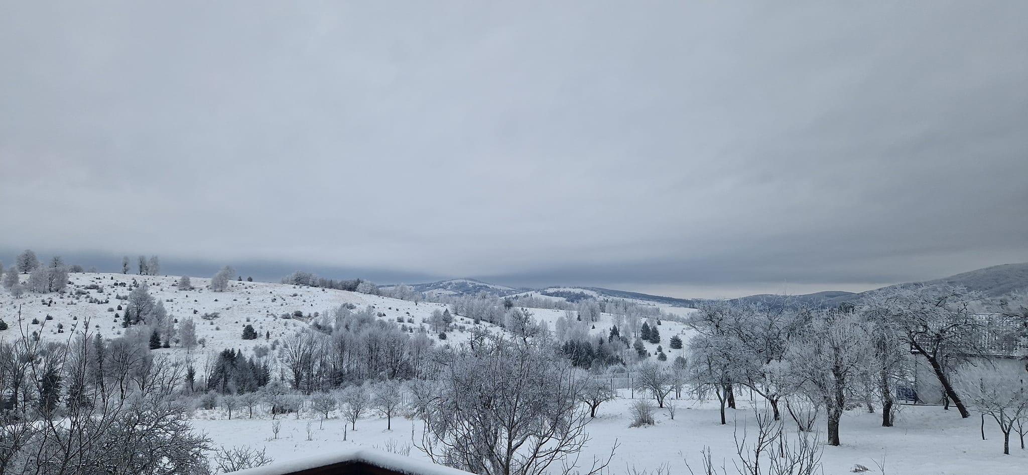 Acesta este decorul varientei cu zăpadă, așa cum se vede pe terasă ori de la balconul fiecărei camere. Indiferent însă dacă a nins sau nu, răsăritul de soare este unic, mai ales dacă este pigmentat cu nori trecători!